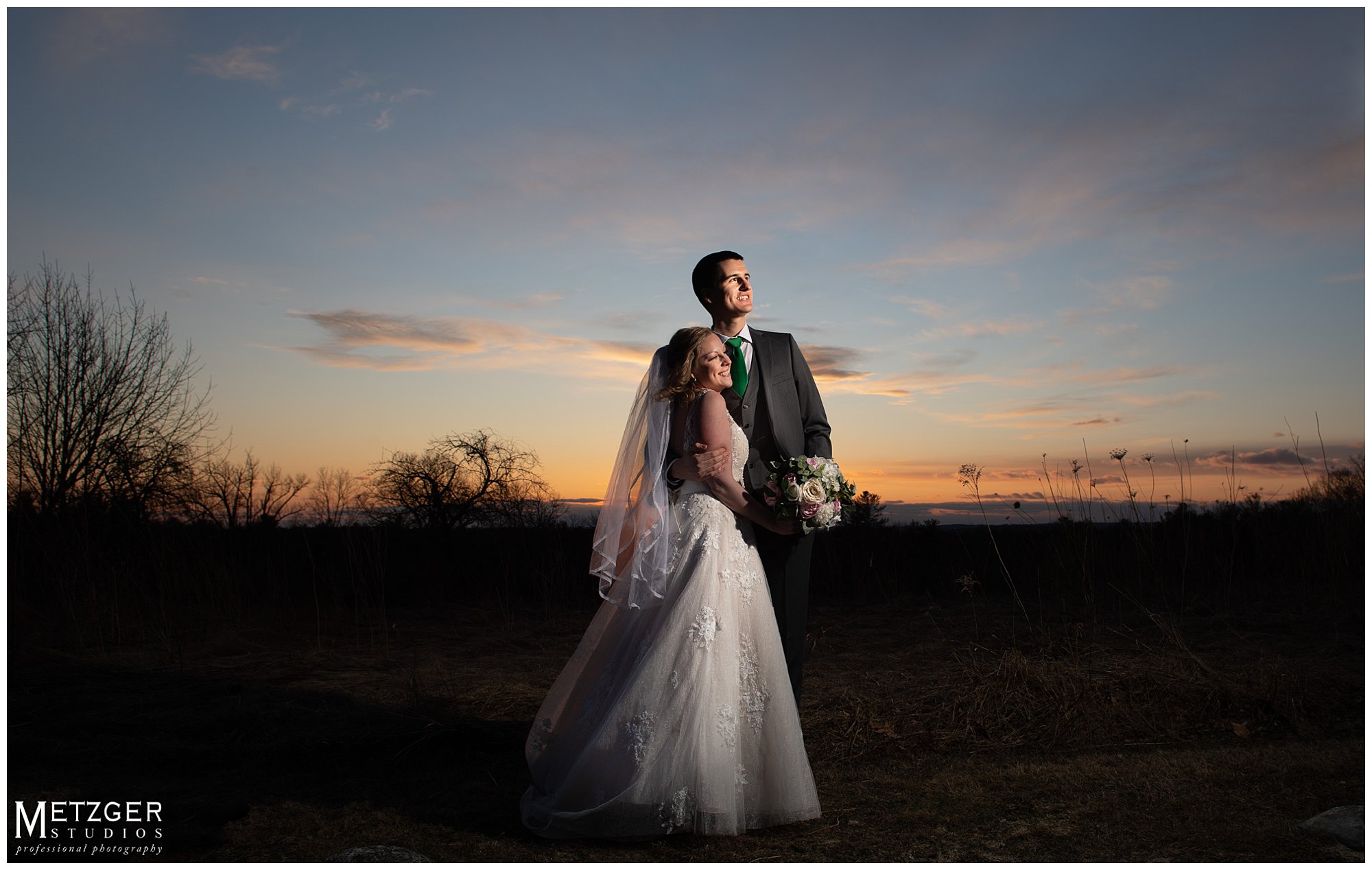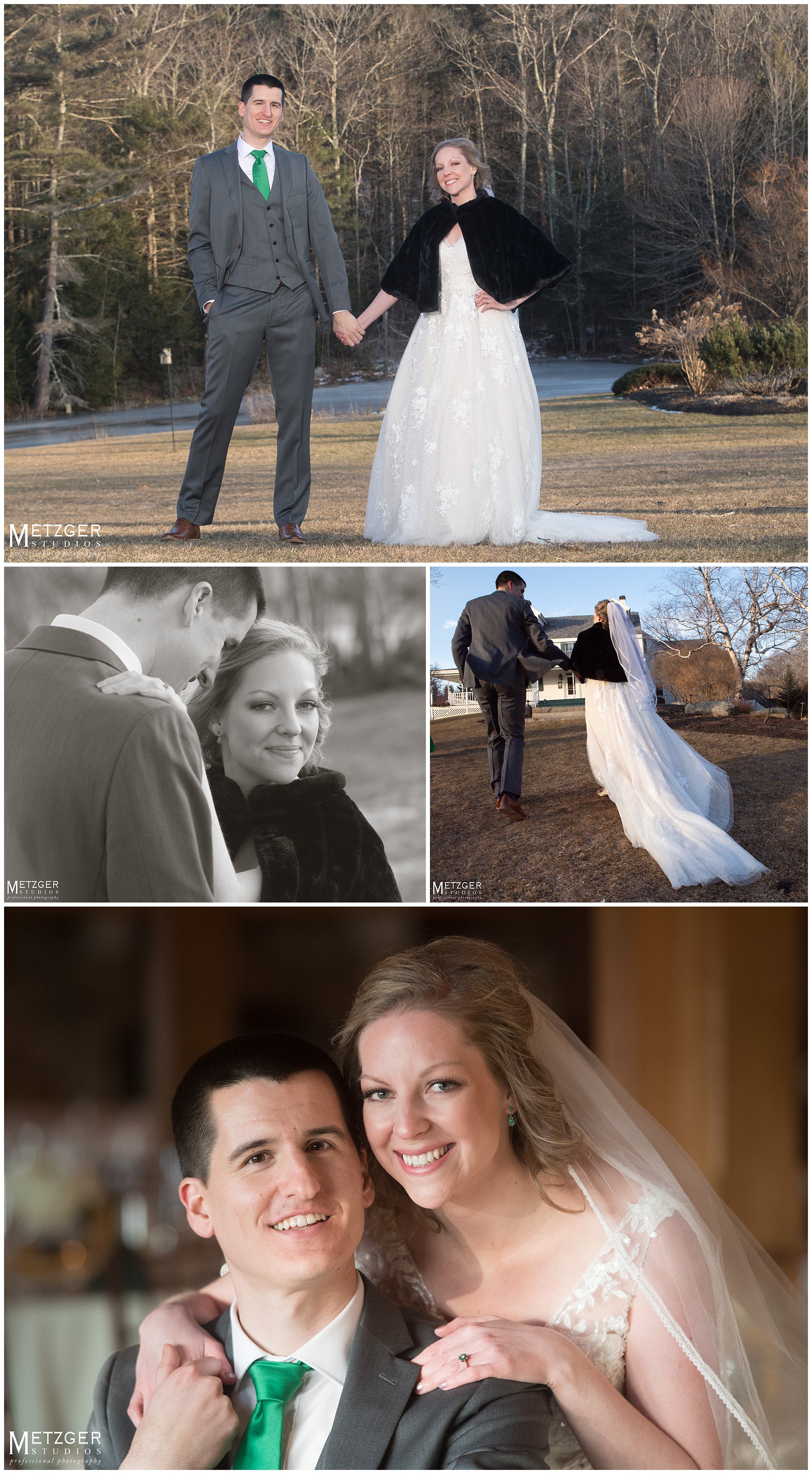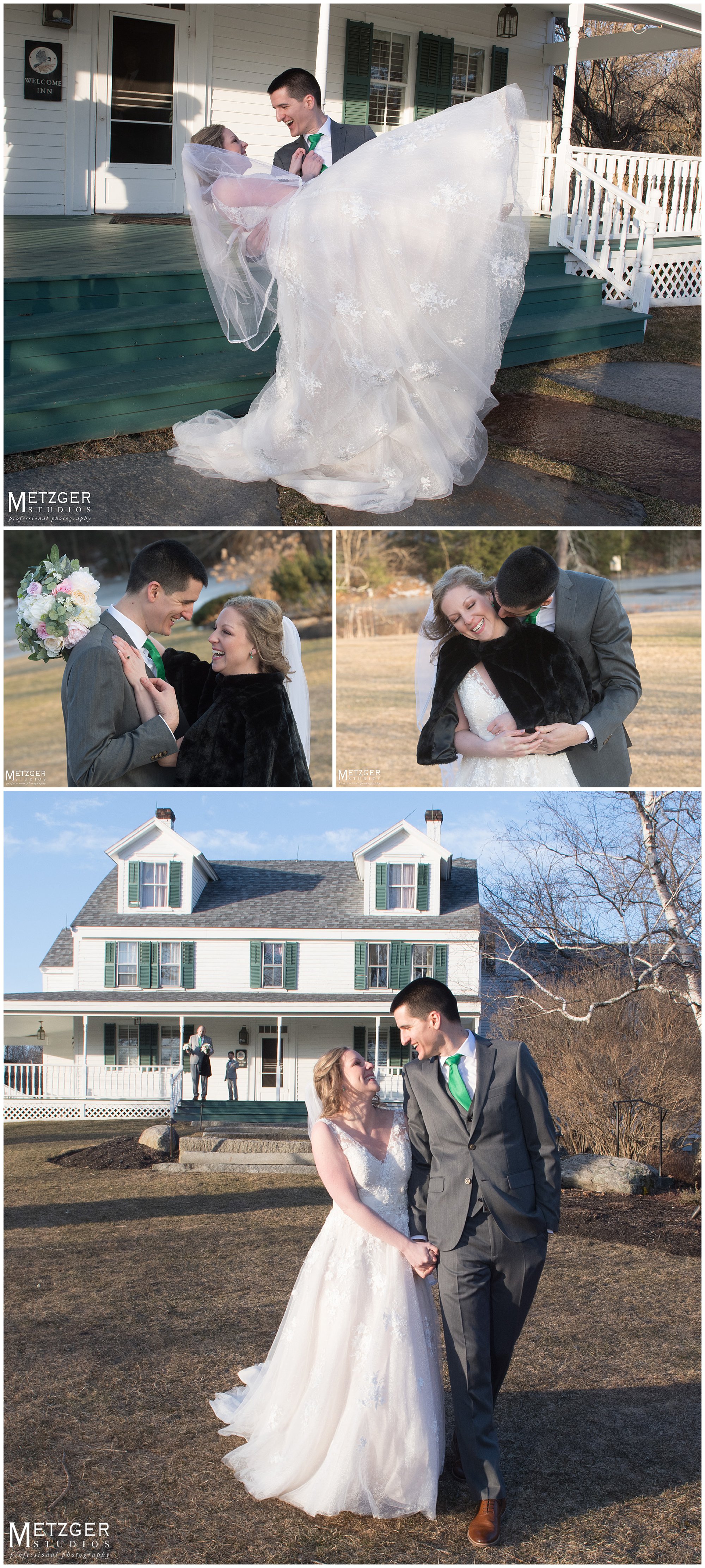 I have great admiration for any couple who choose to have the wedding in New England in the winter. Despite the fact we didn’t have any snow on the ground, we did get a great feel for the rust winter landscape. Not many brides would be outside in the cold in a sleeveless dress, but Sarah was not going to let the weather get in the way of an amazing sunset. There is no better place to shoot any time of year than Harrington Farm. All the photography from the getting ready to the last dance was done on-site. What is so nice about the venue, is that any way you turn the camera there is either a great background and amazing light. Nick and Sarah were having so much fun it made our jobs very easy. Everything came together from the getting ready straight through to the end of the last dance.